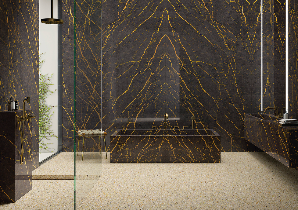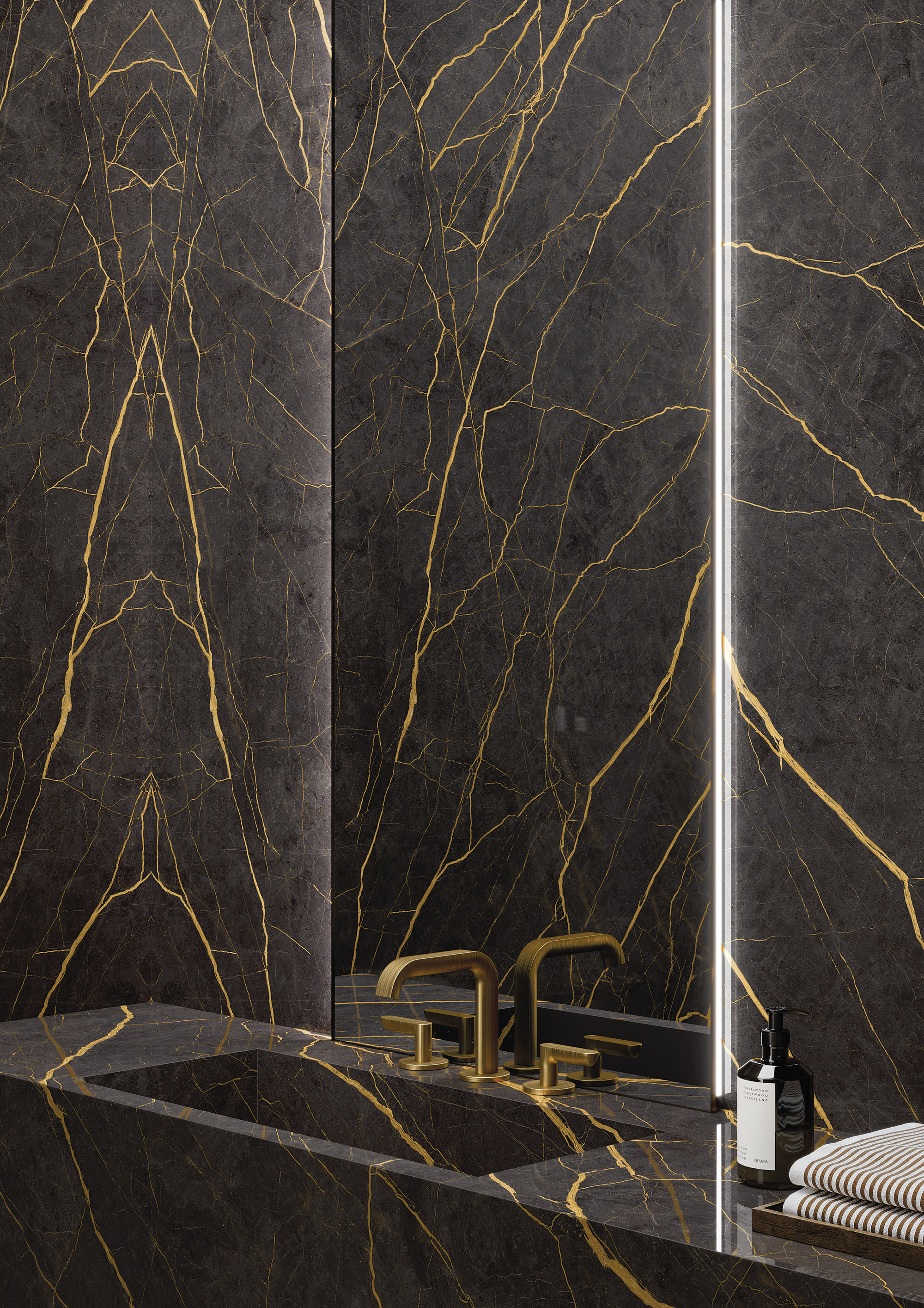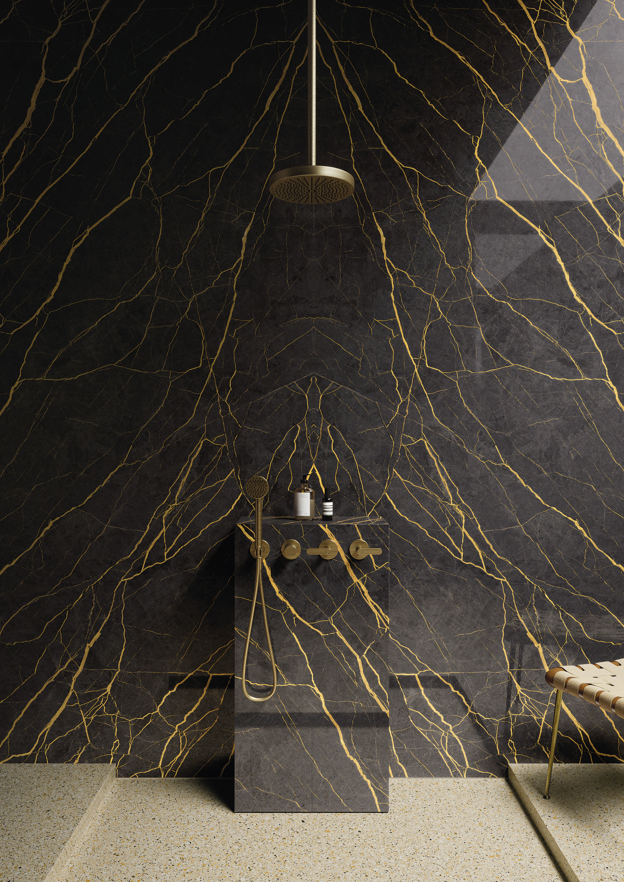 A DEEP BLACK BACKGROUND, CROSSED BY GOLDEN VEINS THAT DANCE LIKE SPARKLING LIGHTS ACROSS THE SURFACE. BOLD, MAGNETIC, SPECTACULAR: A CLADDING THAT INTERPRETS MATTER AS A LANGUAGE, BETWEEN RHYTHM AND DEPTH.