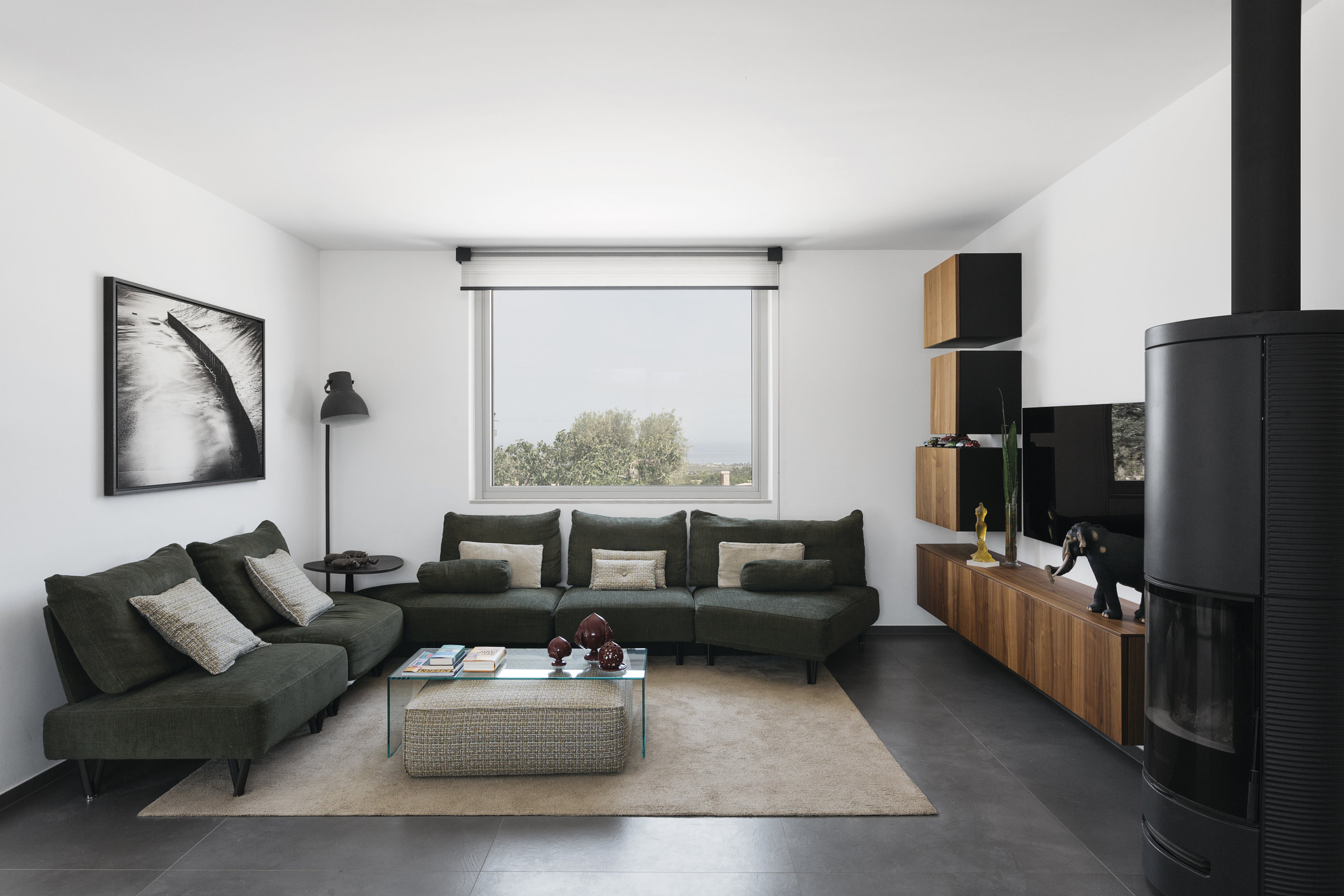 Der großzügige Tageslichteinfall in den Innenbereichen wird durch breite Fenster und Glaswände garantiert, die eine angenehme, durchgehende Durchlässigkeit ins Freie bieten. Die Geometrie der bequemen, einfachen Räume wird durch raffinierte, zweckmäßige Einrichtungen mit schnörkellosen Linien zur Geltung gebracht.