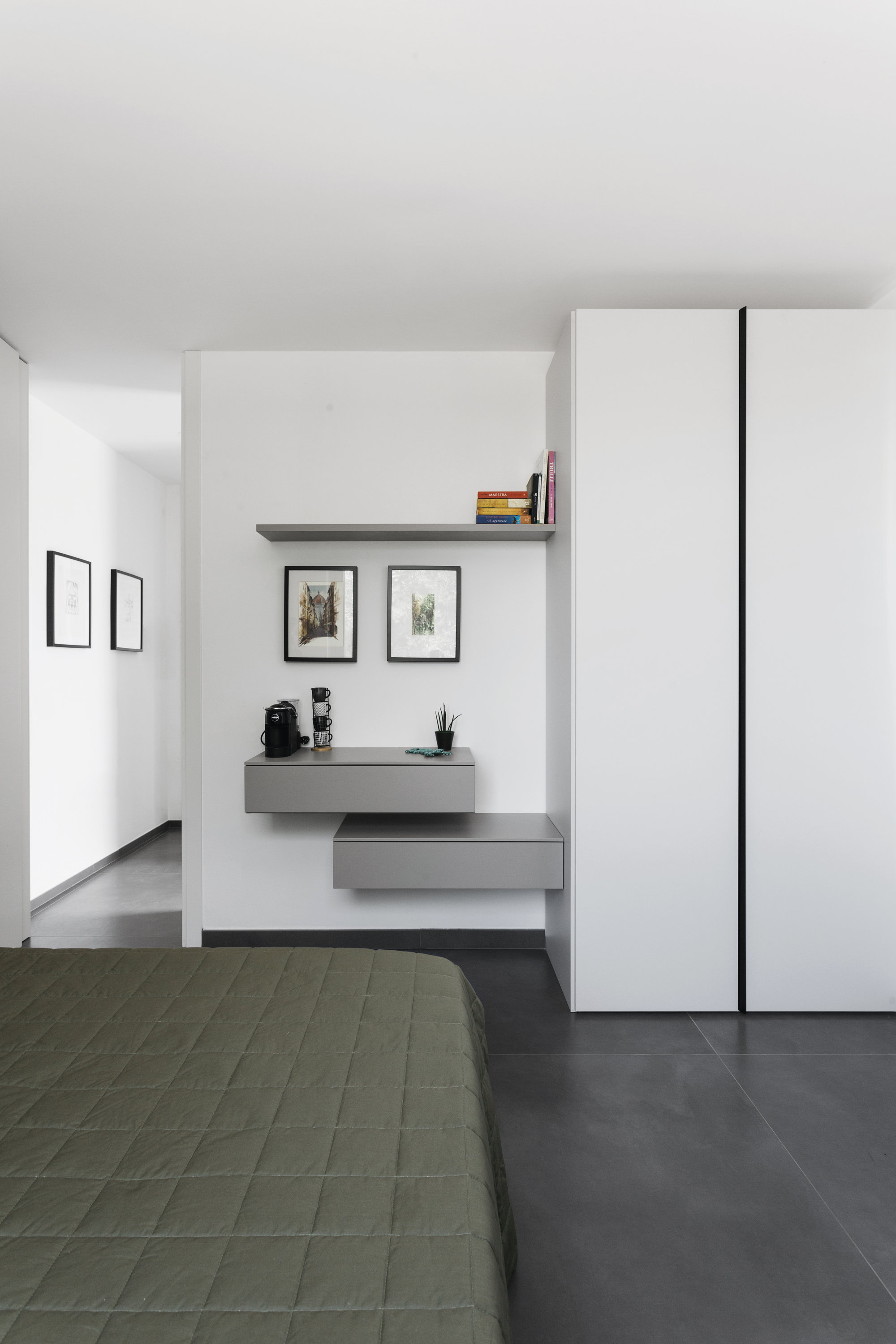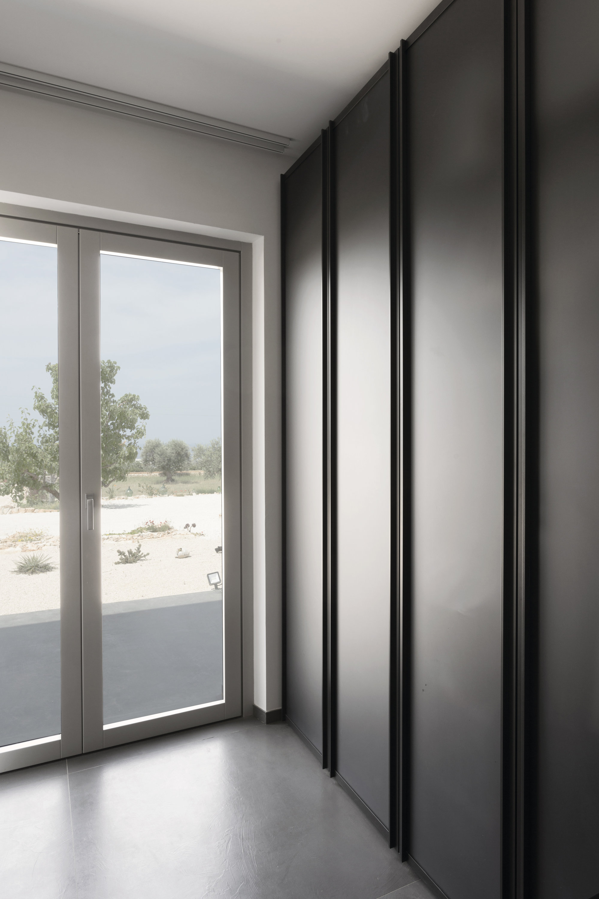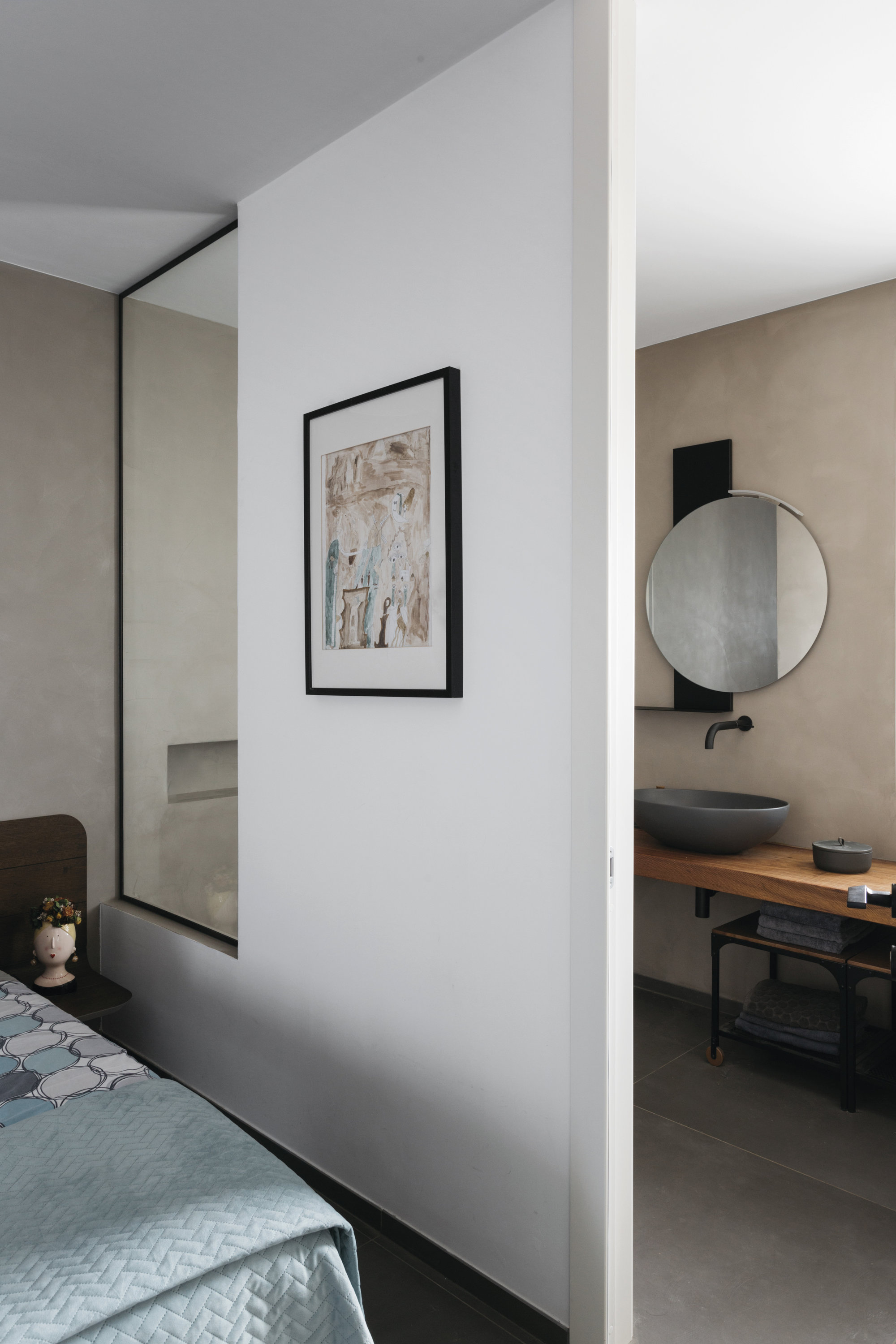 Der überall homogene Fußboden harmonisiert perfekt mit der raffinierten Einfachheit der Villa: Das verdanken wir Con.crea, der Oberfläche aus High-tech-Keramik von Ariostea, die die Ästhetik von gespachteltem Zement und Harz wiedergibt und synthetisiert. Das zarte, ansprechende Muster der in der Färbung Cloud gewählten Kollektion verleiht den Räumen einen originellen Reiz und steht im Einklang mit den Materialien der Gebäudewände und dem Außenboden aus Sichtbeton und dem örtlich gewonnenen Stein von Trani.