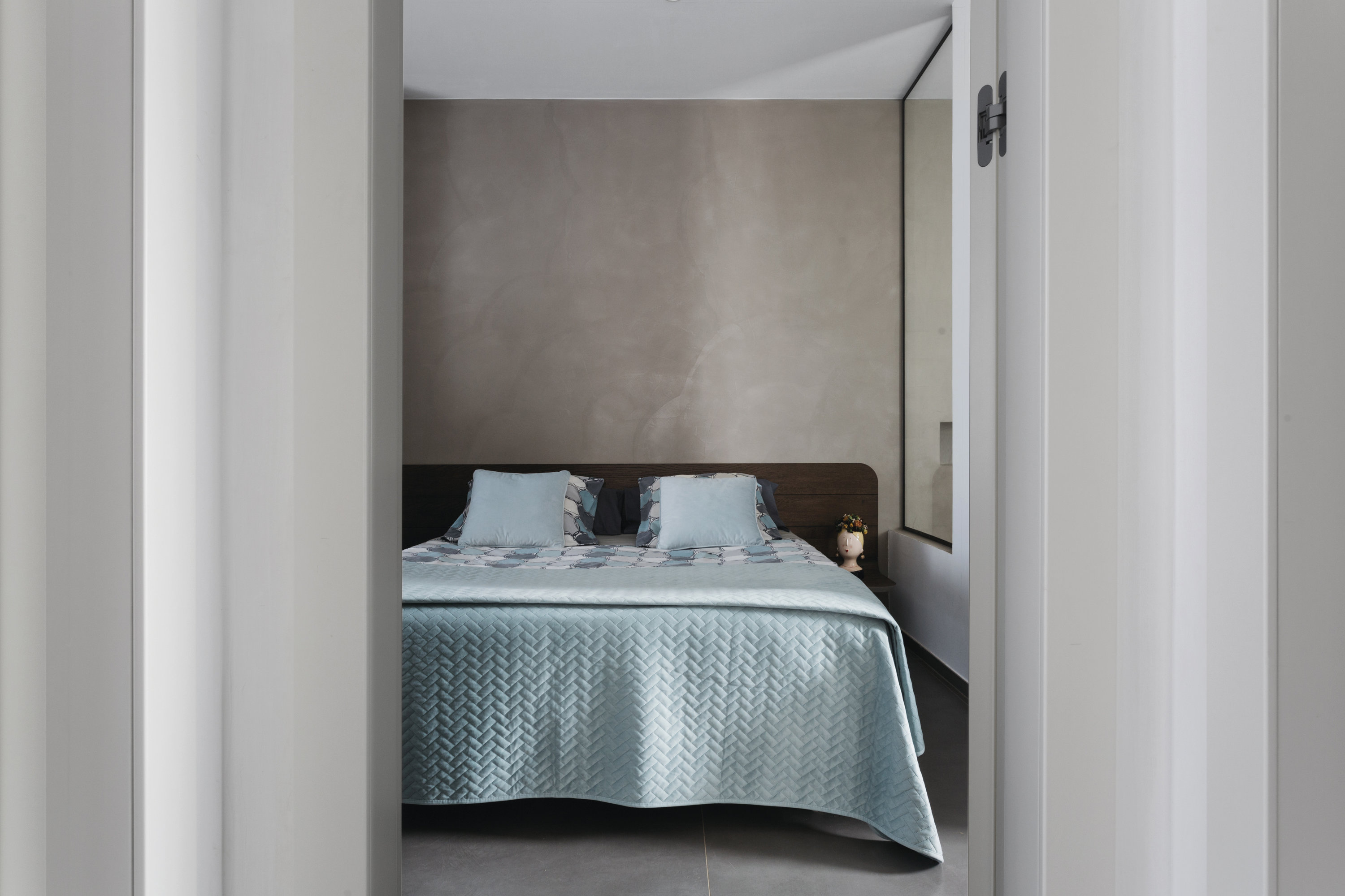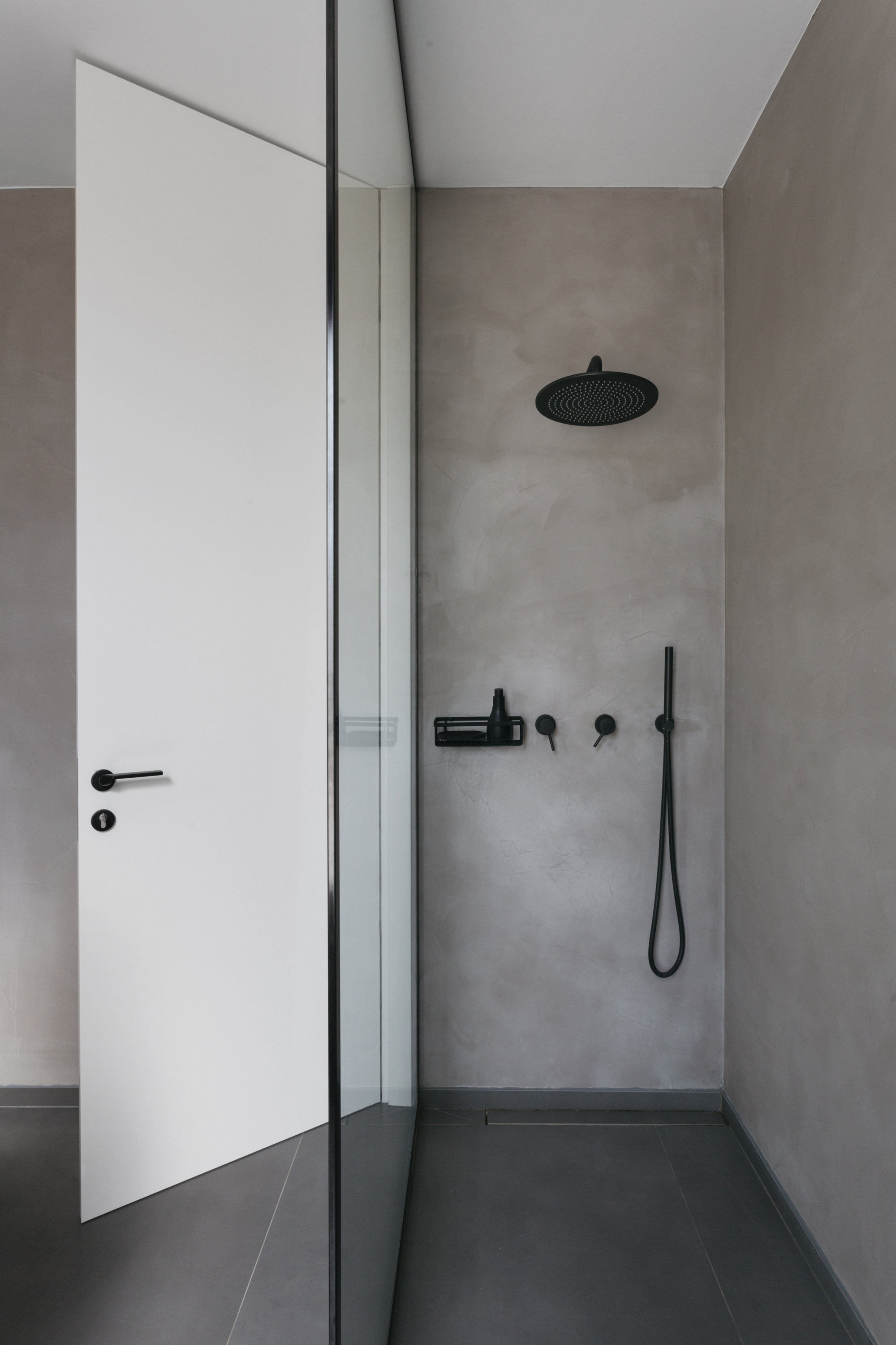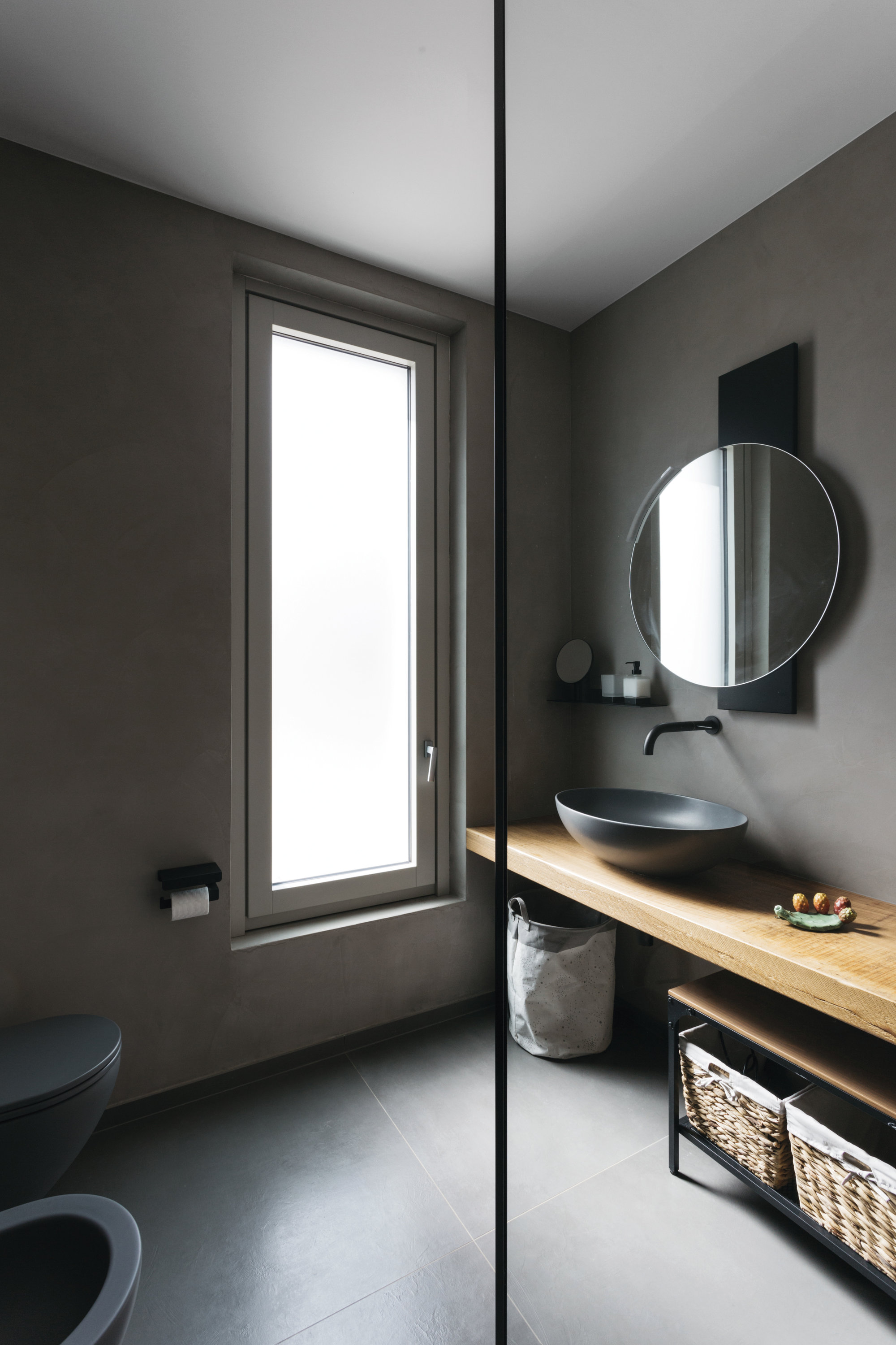 Der überall homogene Fußboden harmonisiert perfekt mit der raffinierten Einfachheit der Villa: Das verdanken wir Con.crea, der Oberfläche aus High-tech-Keramik von Ariostea, die die Ästhetik von gespachteltem Zement und Harz wiedergibt und synthetisiert. Das zarte, ansprechende Muster der in der Färbung Cloud gewählten Kollektion verleiht den Räumen einen originellen Reiz und steht im Einklang mit den Materialien der Gebäudewände und dem Außenboden aus Sichtbeton und dem örtlich gewonnenen Stein von Trani.