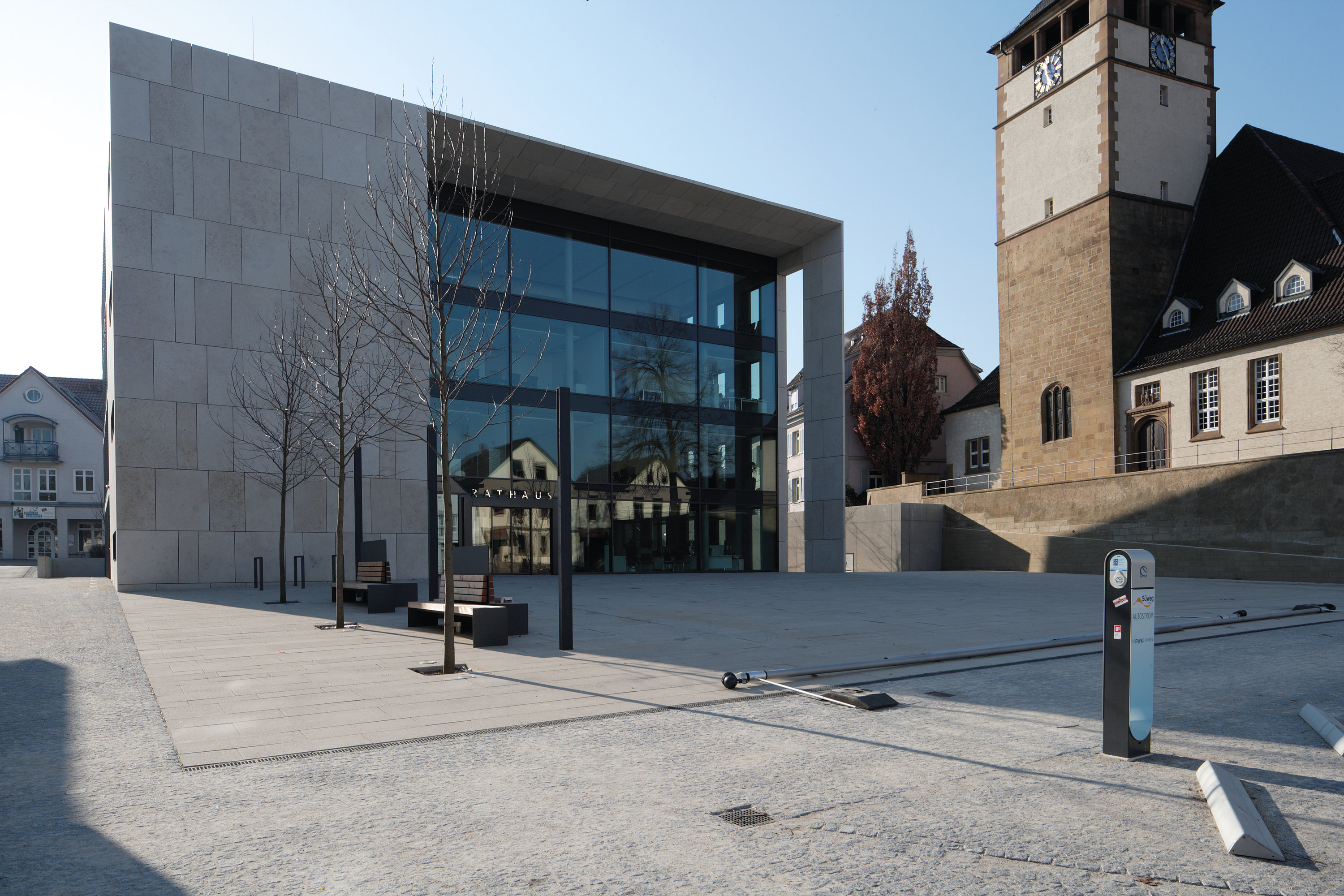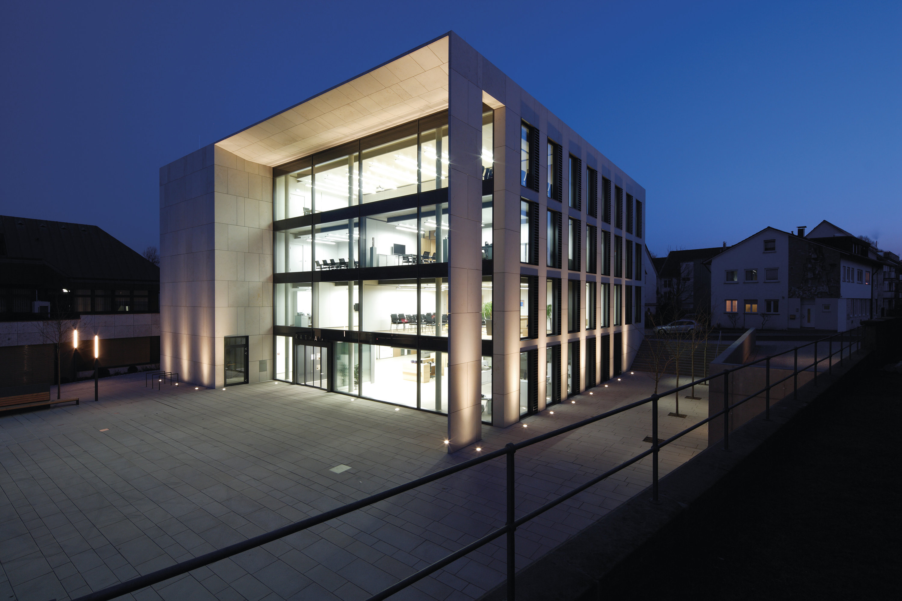 Das 2011 komplett neu errichtete Rathaus Leingarten wurde als kompaktes Gebäude mit klarer kubischer Struktur auf vier Etagen entworfen. Aus dem Gebäude, das an der Stelle des ehemaligen Sitzes aus den 70er Jahren entstand, gibt eine große Glaswand inmitten der Fassade aus hellem Kalkstein den Blick auf den Turm der alten Lorenzkirche frei.