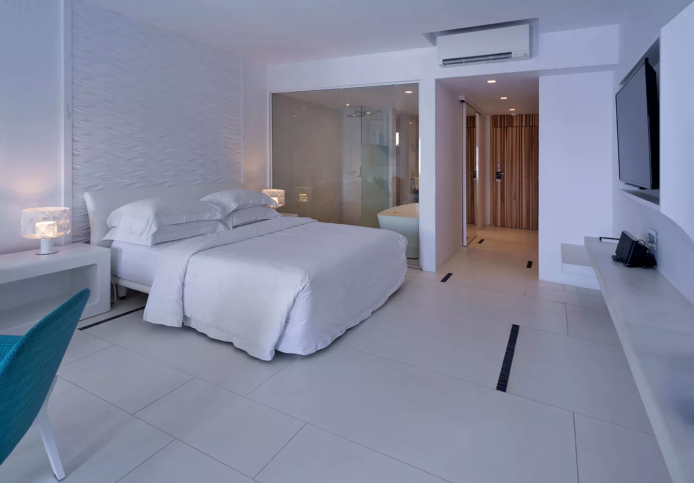 Upon entering a room in the Ambassador, “the eye is drawn to the sea right away, with the classic combination of white and blue”.In this highly evocative colour scheme (sun, sky, beach, stone), a floor made of large Ultra Ariostea slabs with a Soft finish perfectly suits the cleanliness, expressiveness and the sober elegance of the hotel’s architecture.