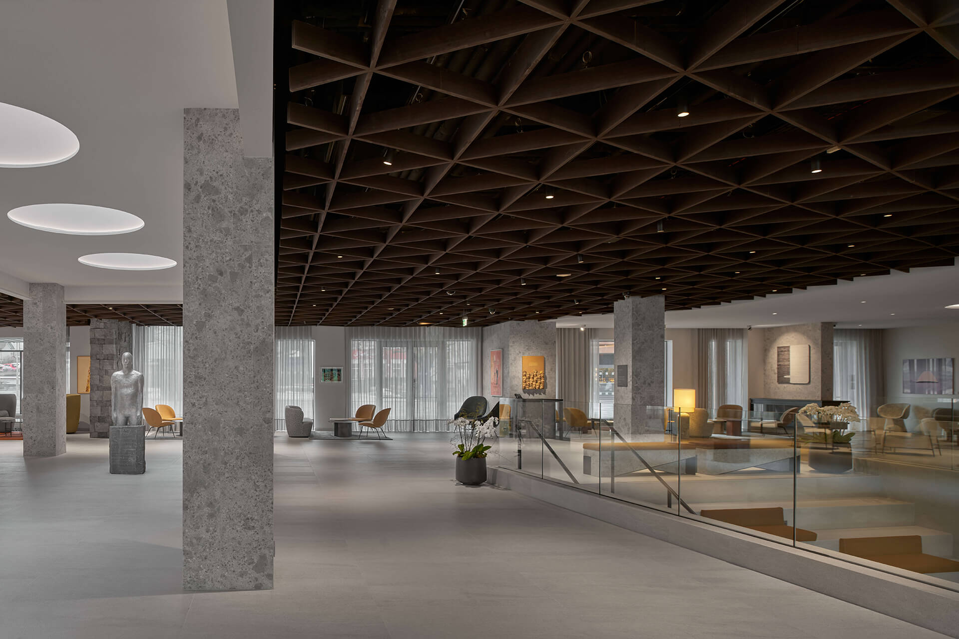 For the ground floor hall of Iceland Telecom, which previously served as the telecommunications headquarters, ceramic ceramic surfaces from Ariostea’s Fragmenta Full Body collection were chosen to adorn the walls. The Grigio Luminoso colour was selected to help create an intimate, cosy and private ambience.