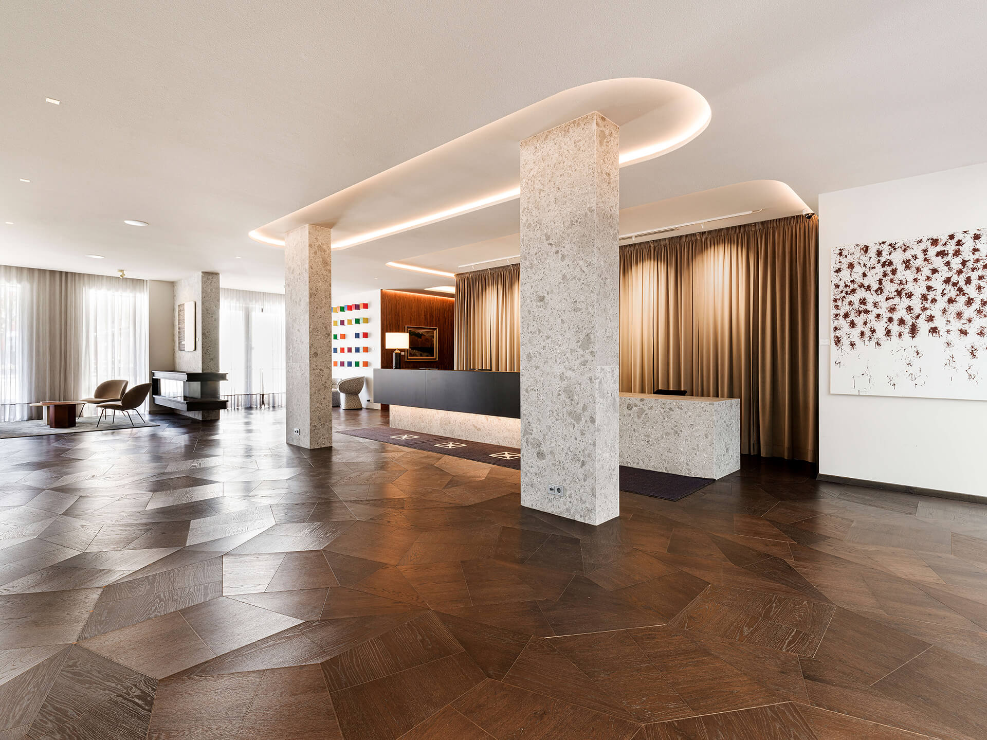 The collection’s matte, radiant and velvety textures envelop the reception desk and supporting columns that define the large area.