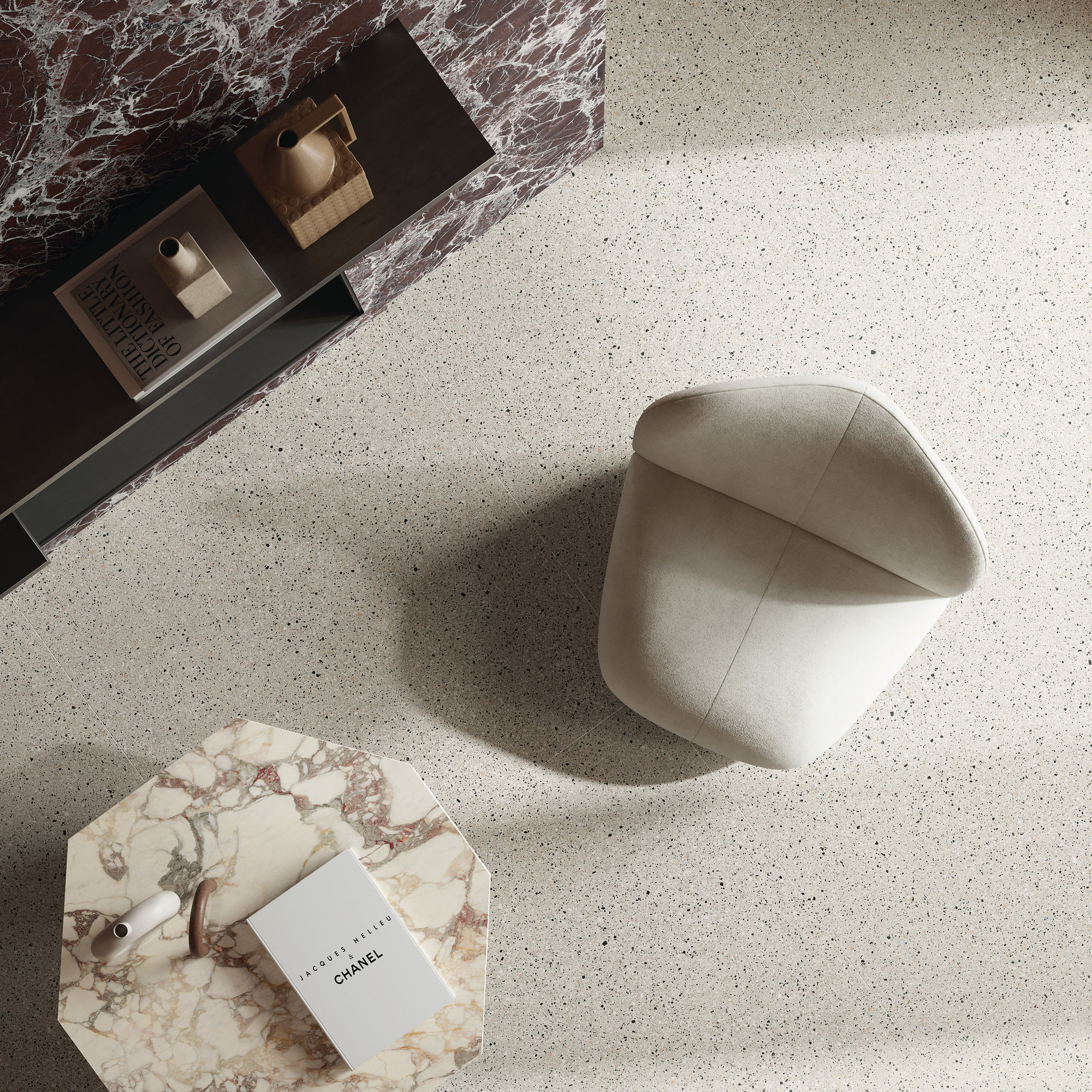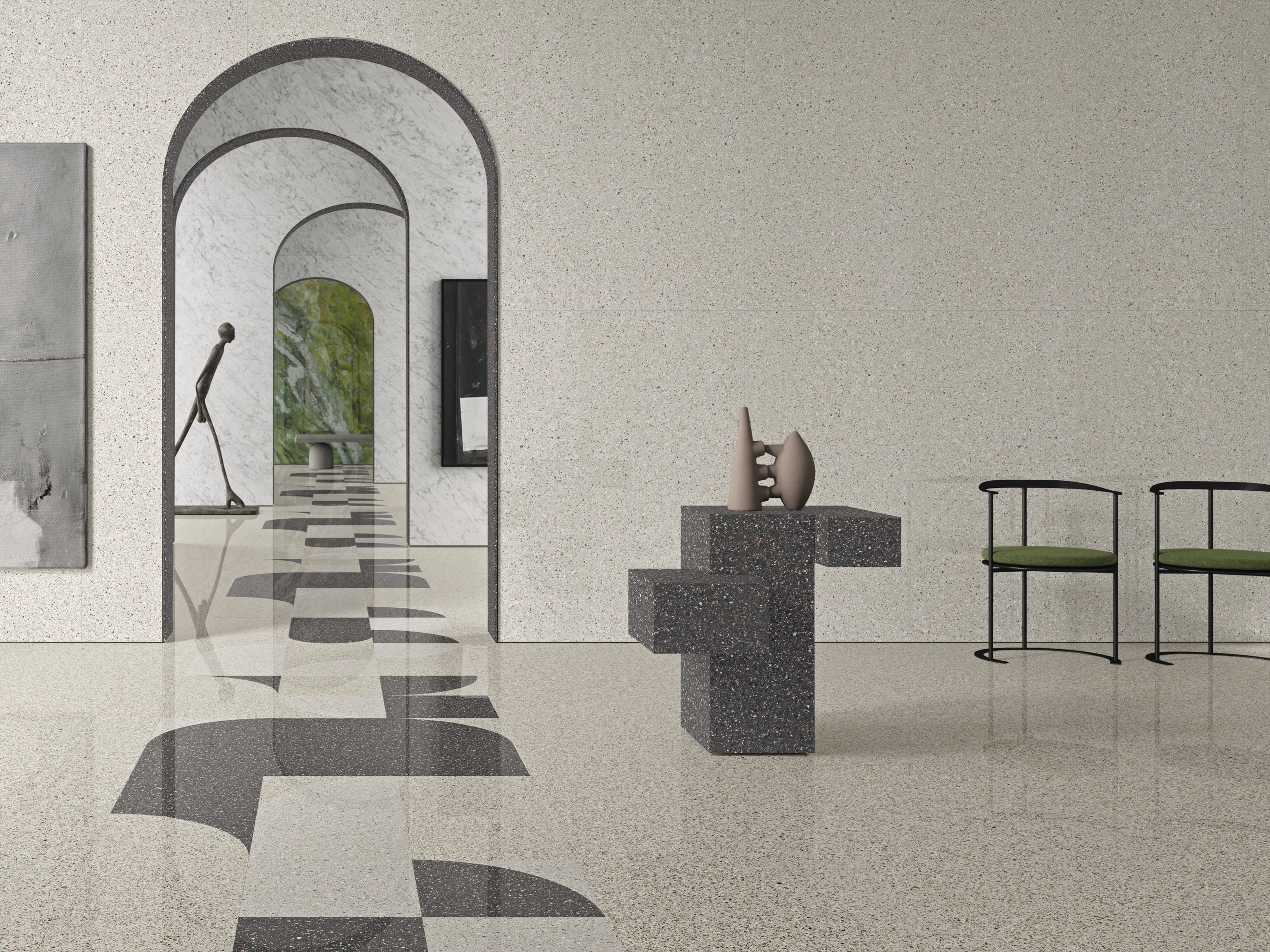 Accademia nasce da una rilettura contemporanea dei pavimenti alla veneziana, dove il valore della memoria si traduce in una superficie compatta e profonda grazie alla tecnologia Fullbody³. La materia attraversa l’intero spessore della lastra, rendendo visibile l’autenticità del gesto progettuale anche nei tagli, nei bordi e nei dettagli costruttivi.