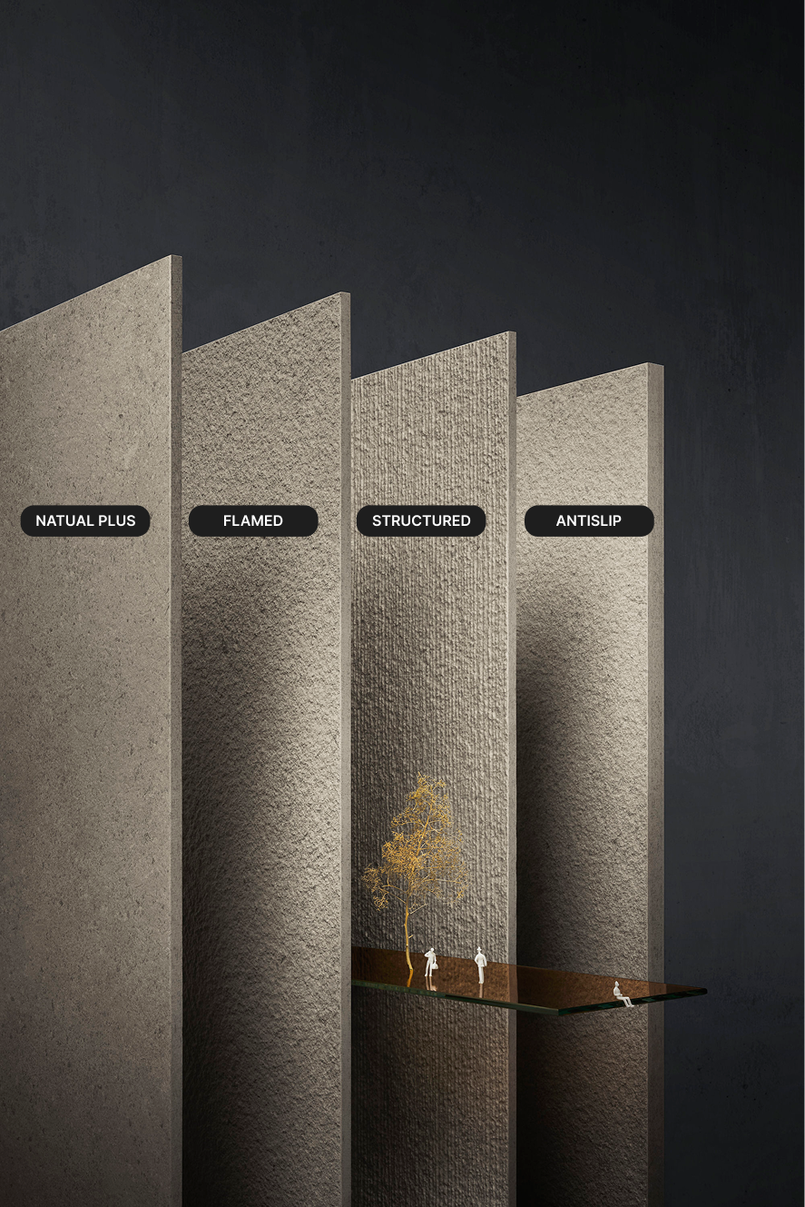 ELEMENTAE OFFRE QUATTRO FINITURE— NATURAL PLUS, FLAMED, STRUCTURED E ANTISLIP—CHE ELEVANO OGNI PROGETTO A NUOVI LIVELLI DI ESTETICA E COMFORT.