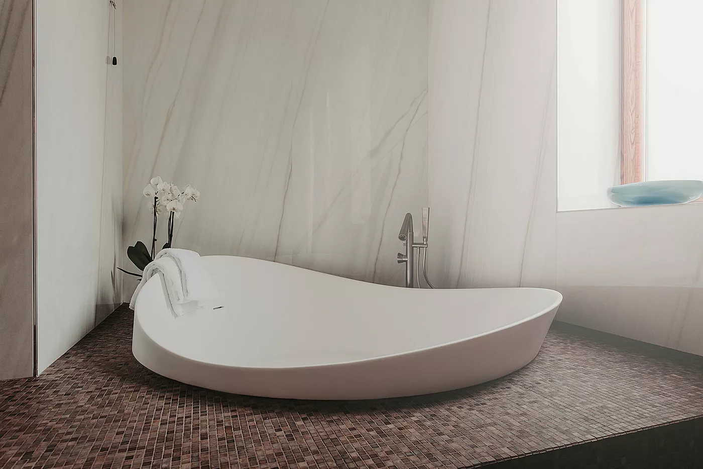 Le grandi lastre effetto marmo, quale il Bianco Covelano, rappresentano un prodotto classico e al tempo stesso contemporaneo, capace di unirsi in modo esemplare nello spazio dedicato al wellness del Bacã Suite, dove sono presenti complementi quali vasca bagno turco, doccia emozionale e chaise longue per il relax di coppia.