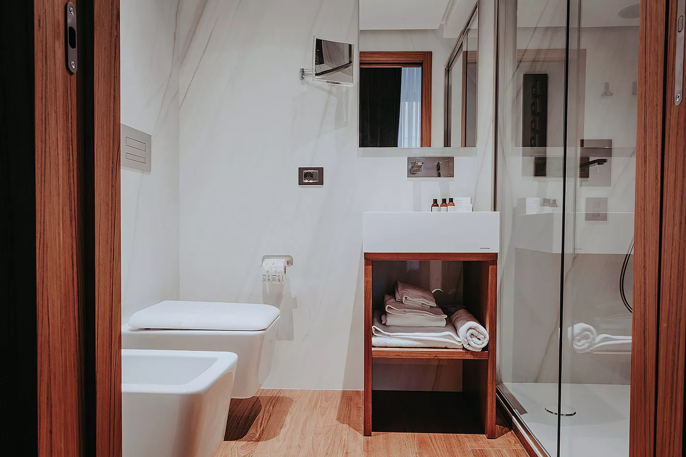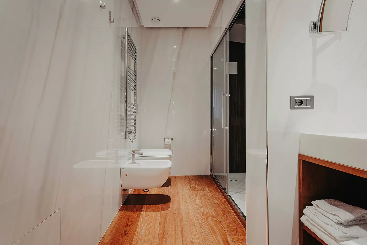 Su questo concept, la scelta dei rivestimenti dei bagni delle suite si è indirizzata, in modo quasi naturale, verso un prodotto di prestigio ceramico italiano, quale la maxi lastra Ariostea Bianco Covelano, nella finitura Shiny e nel grande formato 300×150.
