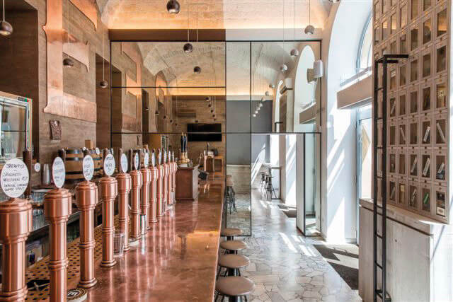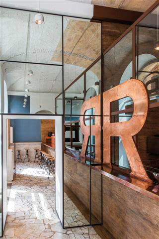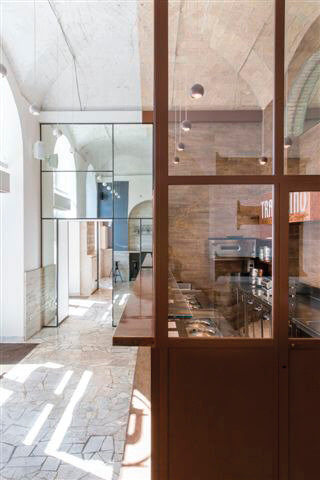 L’area adibita al servizio risulta connotata dall’uso del rame, dei rivestimenti a effetto legno e dal mattone delle volte originali lasciato a vista, un sapore generale volutamente carico, contrapposto ai toni tra il bianco e il grigio che caratterizzano invece la zona accessibile alla clientela, principalmente riconoscibile per il recupero delle pavimentazioni originali in palladiana di marmo di Carrara.