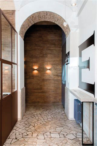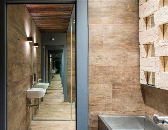 I locali bagno concludono coerentemente il locale, sommando elementi vecchi quali i mattoni pieni recuperati dalle opere di demolizione, utilizzati per ritrarre un’anomala parete a specchio velata dalla cortina sfalsata di mattoni, con i caratteri progettuali contemporanei, propri del locale.