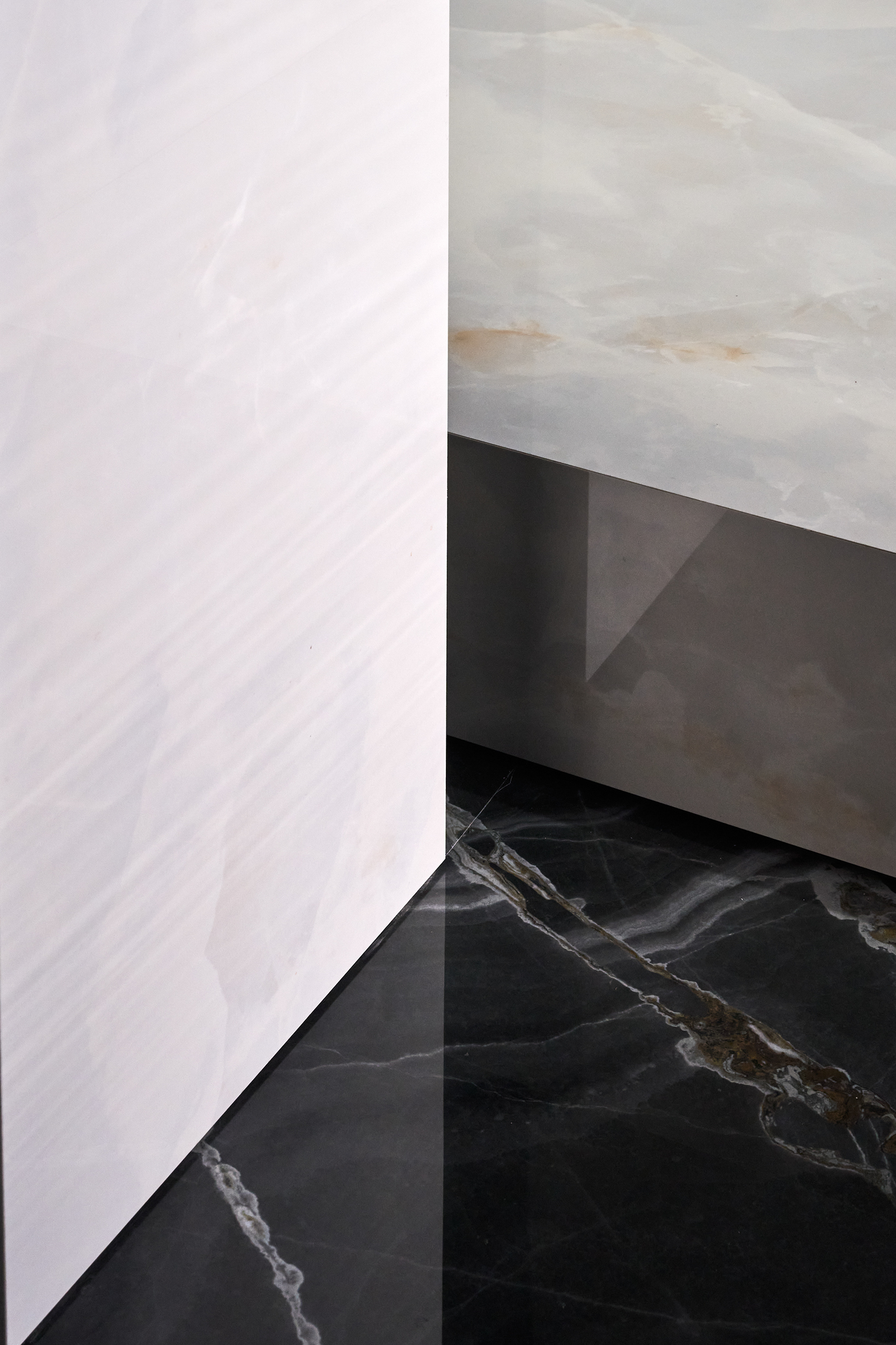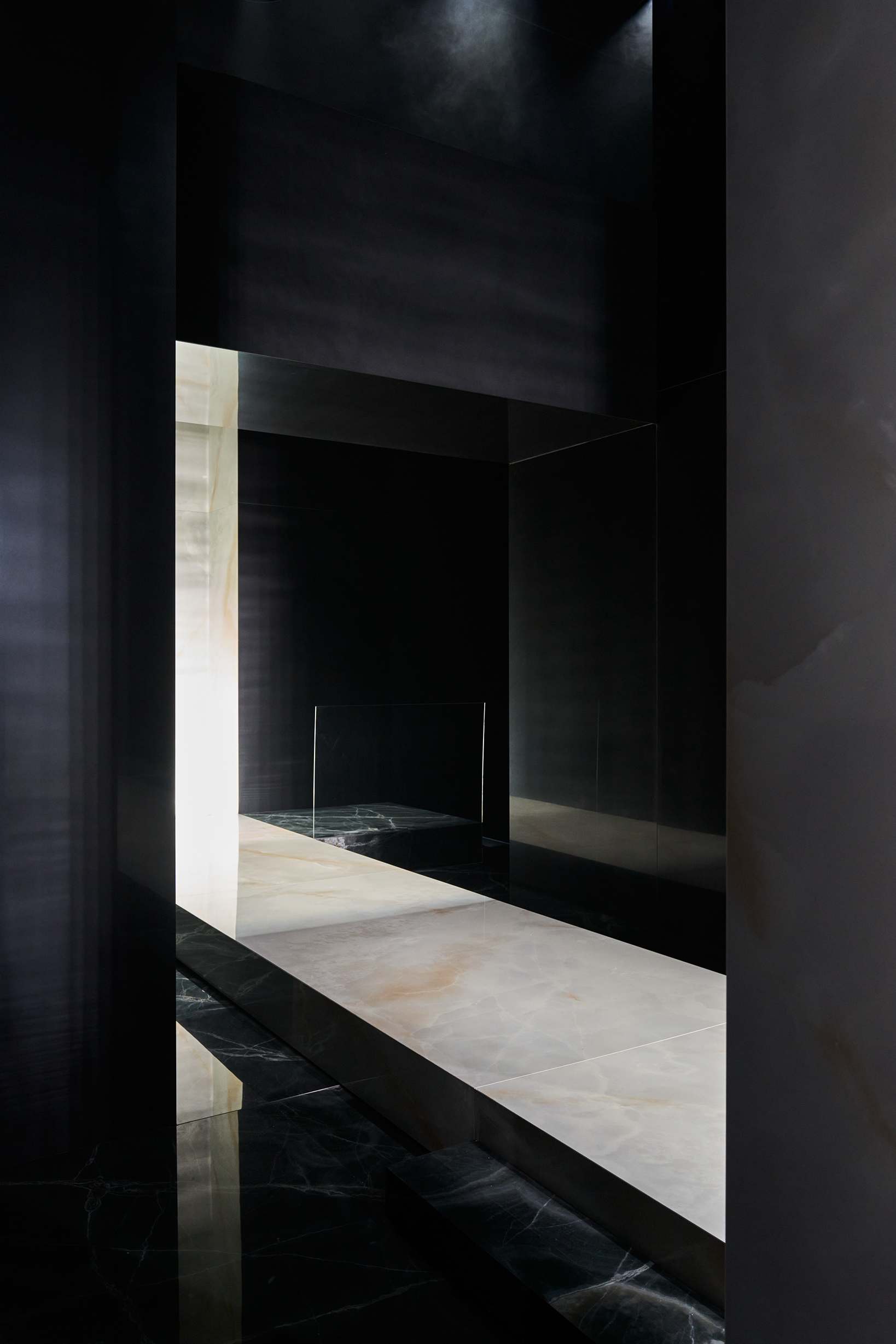 La scelta cromatica ha puntato sull’intensità del nero assoluto di Uni Pepper, sulle sfumature fumé di Majestic Onyx – entrambe superfici del brand Fiandre – e sulle venature dorate di Onice Grigio di Ariostea. La finitura Polished ha amplificato la dinamicità dei riflessi, delle luci e dei movimenti, costruendo una cornice elegante e di grande impatto scenico che valorizza la sartorialità degli abiti.