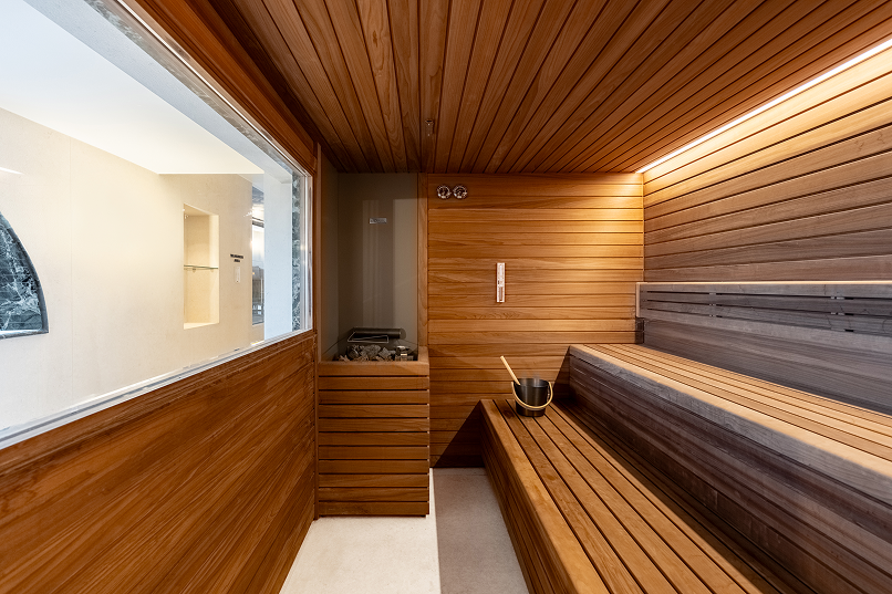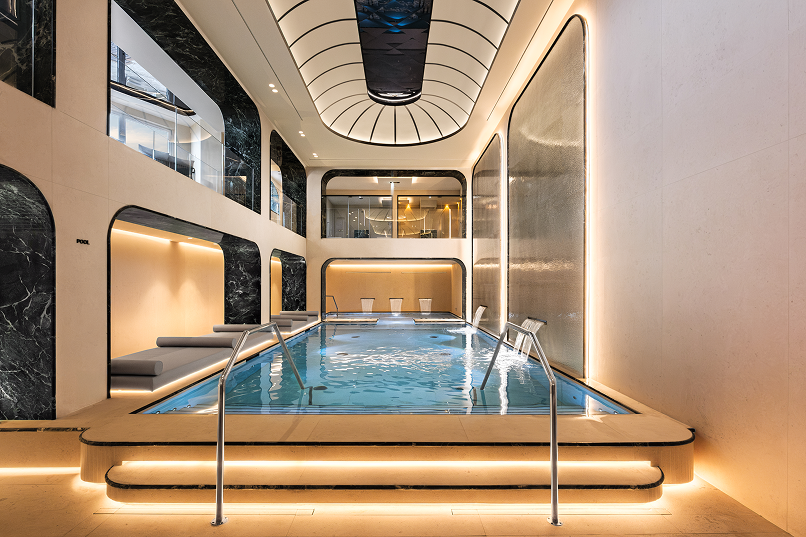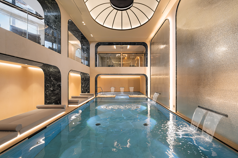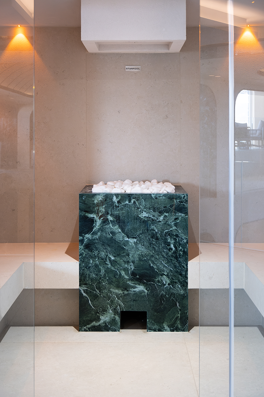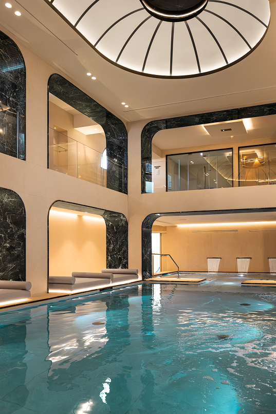 Il concept di Studio Marco Piva si articola su più livelli, seguendo due direttrici complementari: un restyling conservativo che valorizza gli elementi esistenti e un ampliamento funzionale che reinterpreta le forme e i colori della Liguria. La Spa si sviluppa con una piscina di 68 mq come cuore centrale, circondata da ambienti che si diramano su più piani e che includono una varietà di saune, bagni turchi e docce emozionali, ciascuno progettato per rispondere a specifiche esigenze di temperatura e umidità.