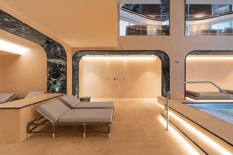 Le ceramiche high tech Saint Denis Ultra e Crema Luna Ultra di Ariostea plasmano gli ambienti dell’esclusivo centro wellness per un’esperienza di benessere multisensoriale