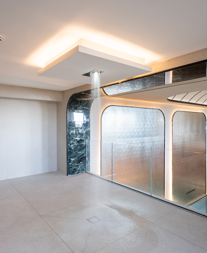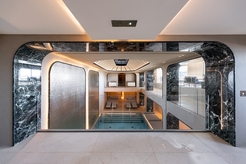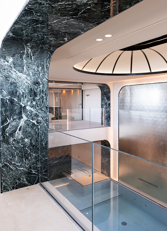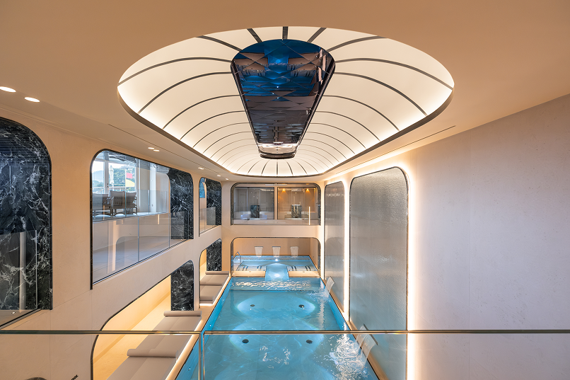 L’architettura interna riflette le forme fluide del mare, con ampi portali e superfici vetrate che amplificano la profondità visiva, mentre una maestosa cupola a specchi infonde leggerezza. Ogni dettaglio strutturale e di interior design è stato studiato su misura per creare un dialogo coerente tra estetica e funzionalità.