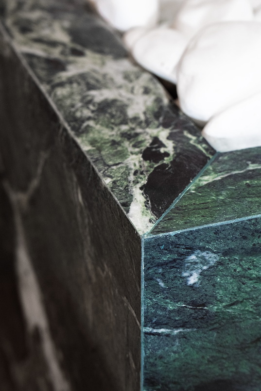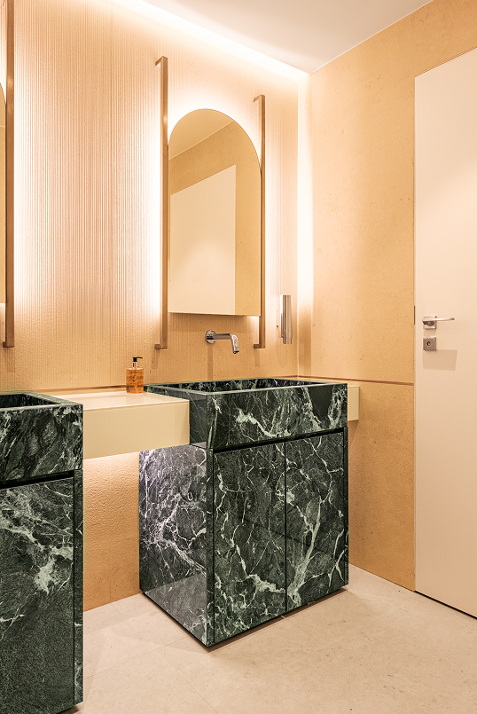 La scelta stessa dei materiali rende omaggio alla Liguria. Verde Saint Denis Ultra di Ariostea con le venature del pattern richiama le increspature e i colori dell’acqua costiera. Con lavorazioni personalizzate, è stato utilizzato per enfatizzare elementi architettonici come le cornici dei gradini, i bordi piscina e i maestosi portali. La sua presenza si estende anche a complementi d’arredo custom, tra cui piani di side table e lavabi di alta fattura.