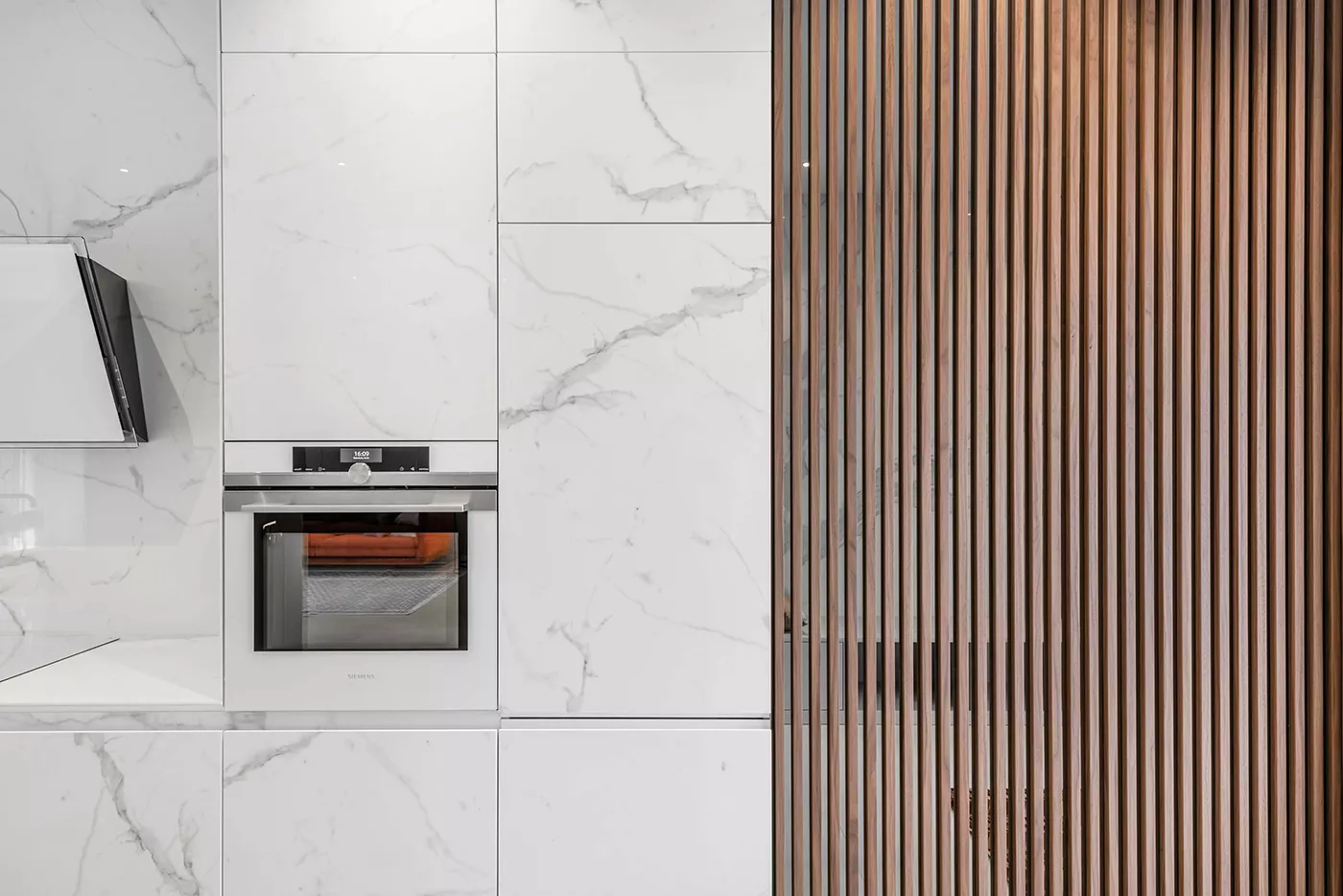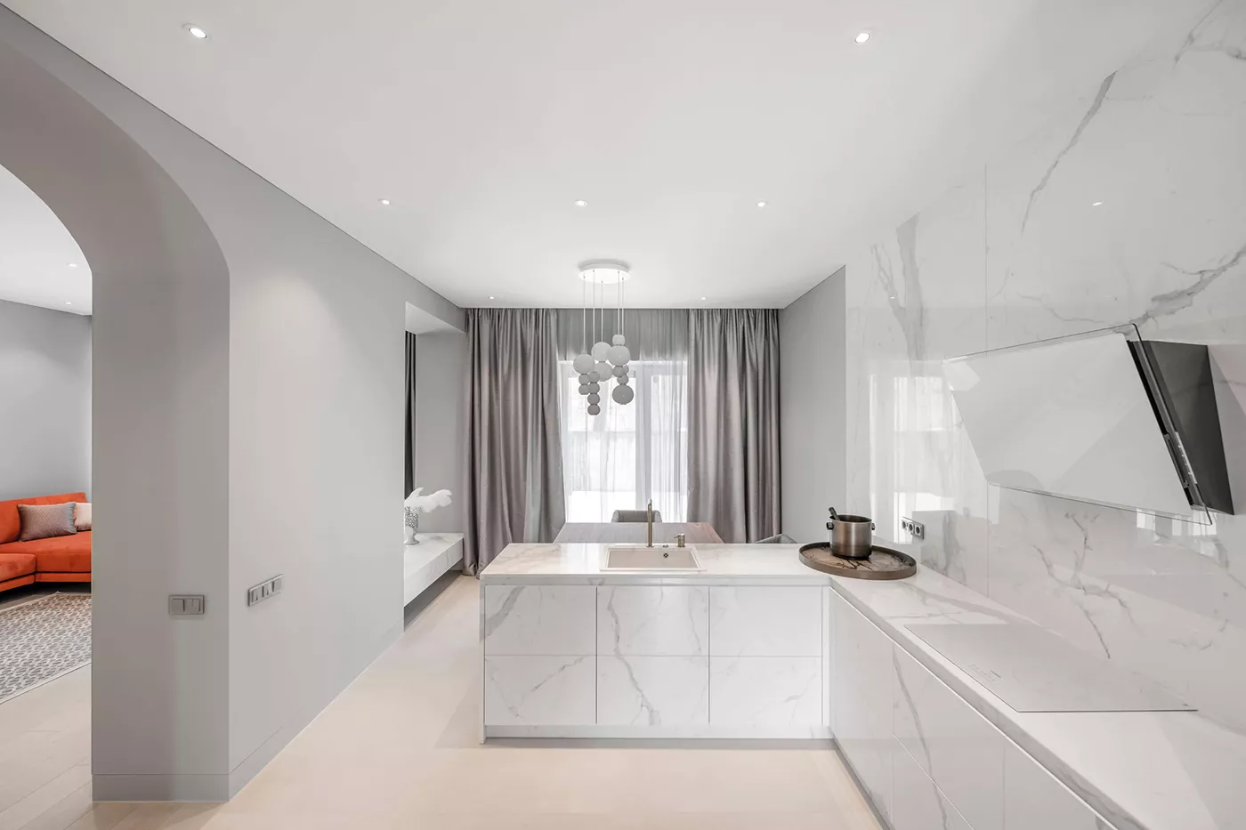 Un dialogo continuo tra le varie stanze, in cui le lastre Ariostea sono le assolute protagoniste grazie alla cromia bianca di Ultra Marmi Calacatta.<br> La scelta della ceramica tecnica in grande formato è una soluzione che ottimizza tutte le proprietà della grandi lastre Ultra Ariostea.