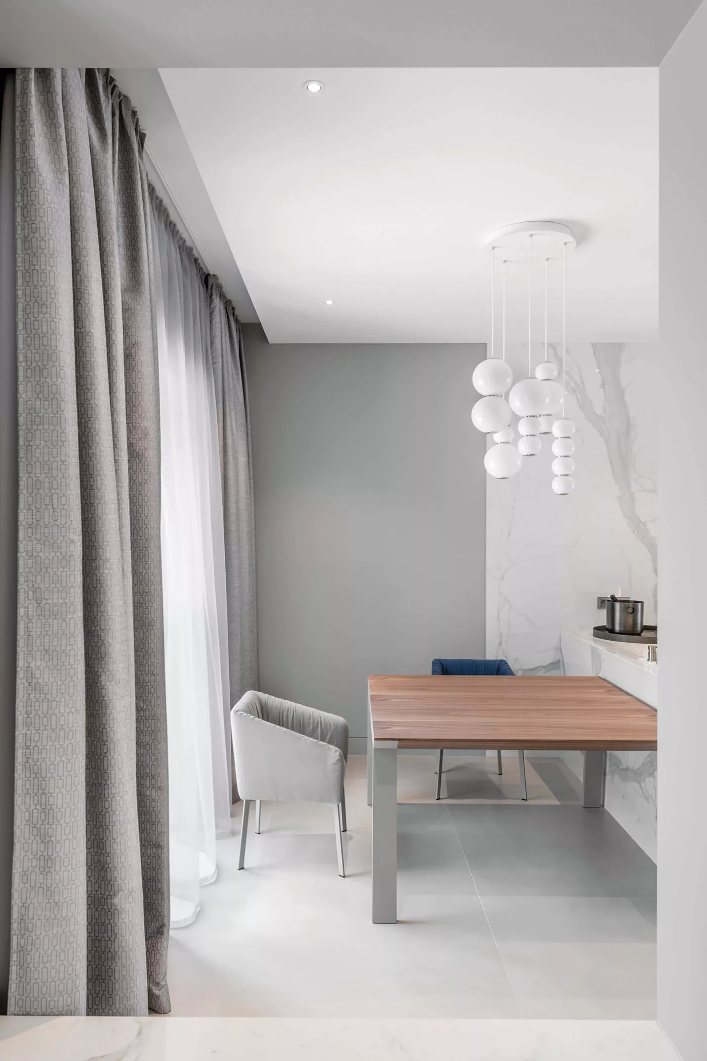 Il pattern del marmo Calacatta Bianco suggerisce inoltre, fin dal primo sguardo, una raffinata eleganza, senza ostentazioni, ulteriormente esaltata dal tocco dinamico e delicato che crea grazie al gioco di accostamenti tra le leggere venature in toni di grigio.