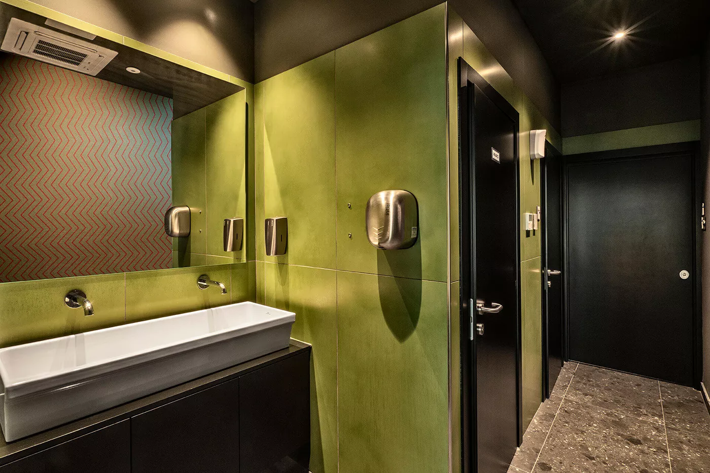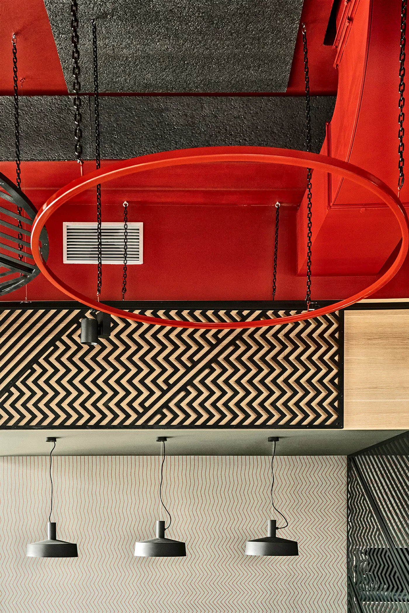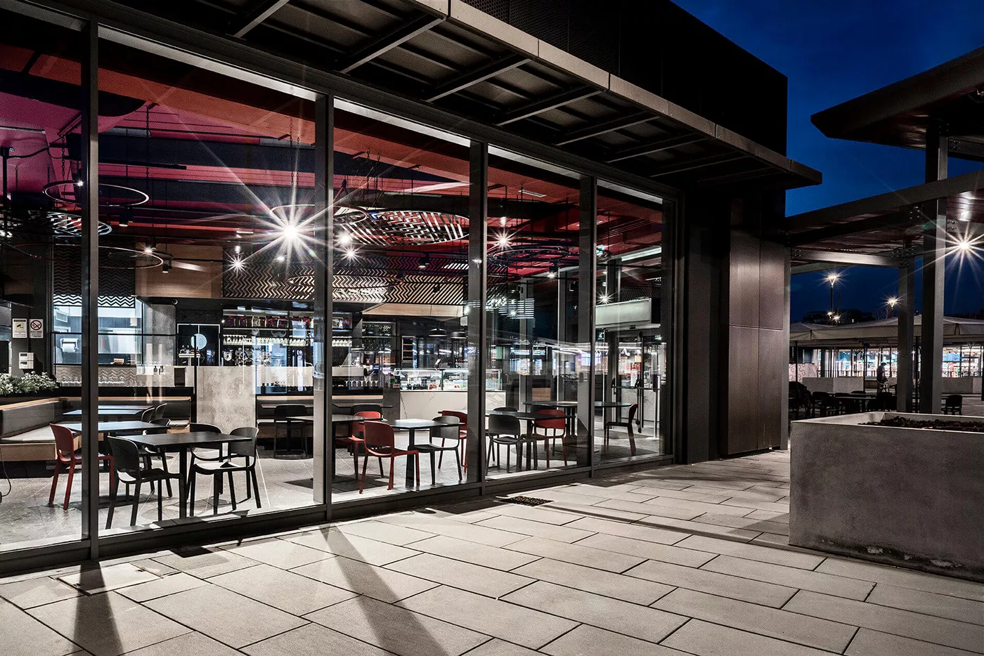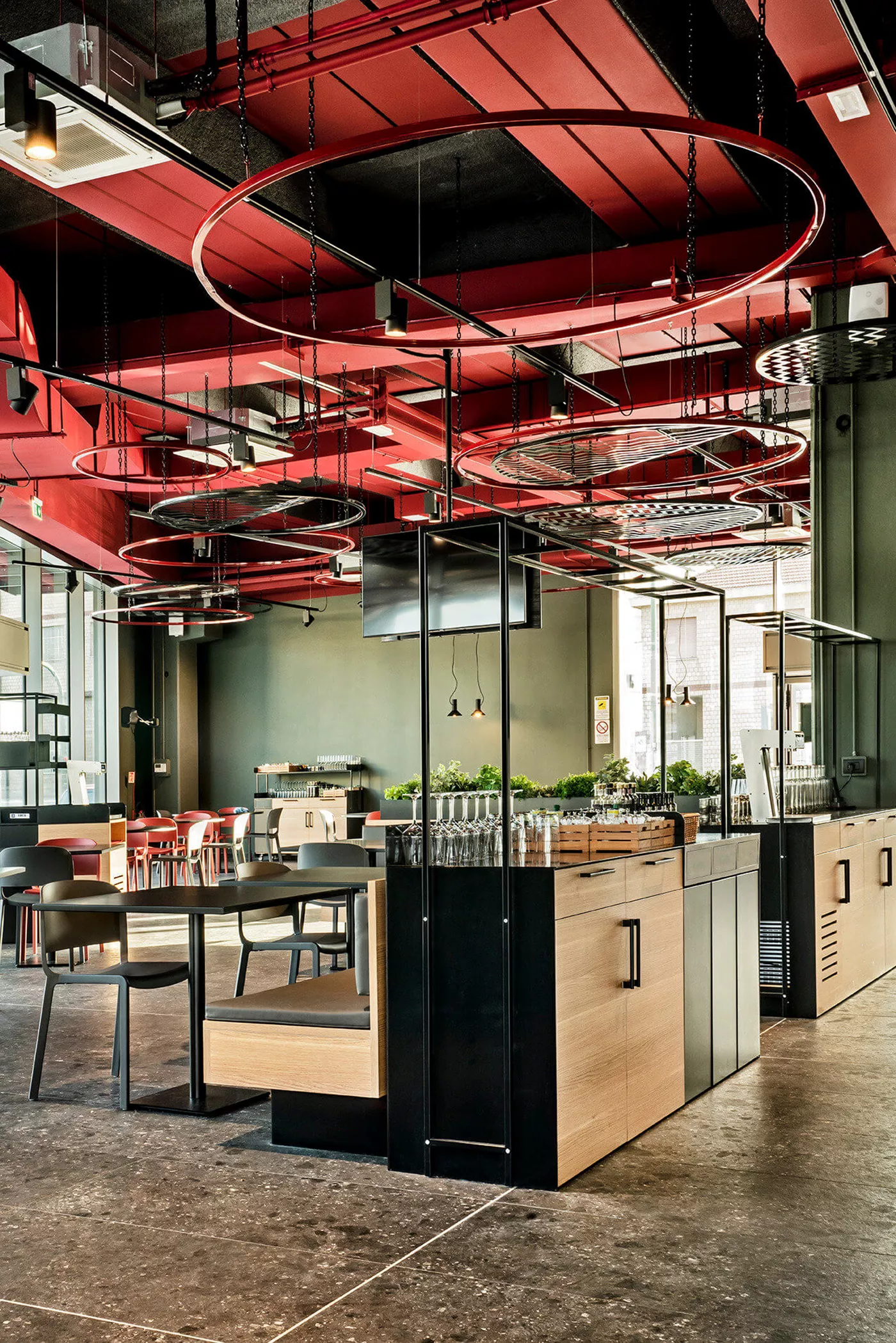 Gli elementi di arredo funzionale come le panadore sono progettati e realizzati ad hoc, contribuendo a definire ulteriormente lidentità del locale, le cui diverse anime sono dichiarate dalle insegne in neon con un linguaggio vivido ed esuberante.