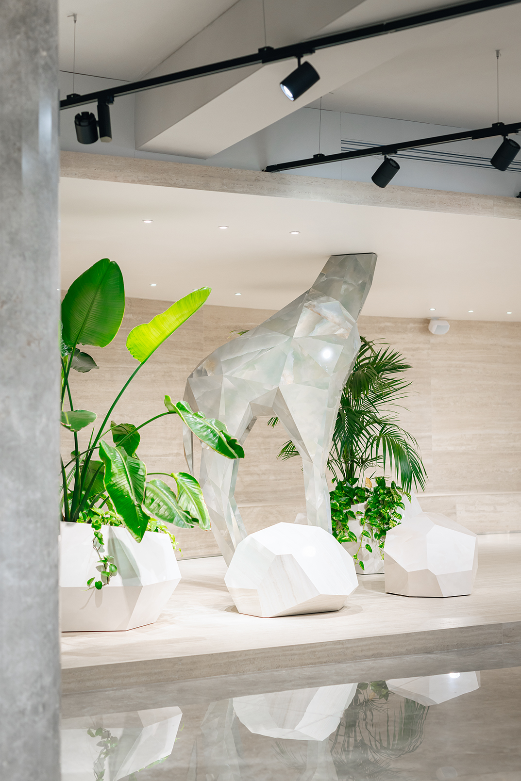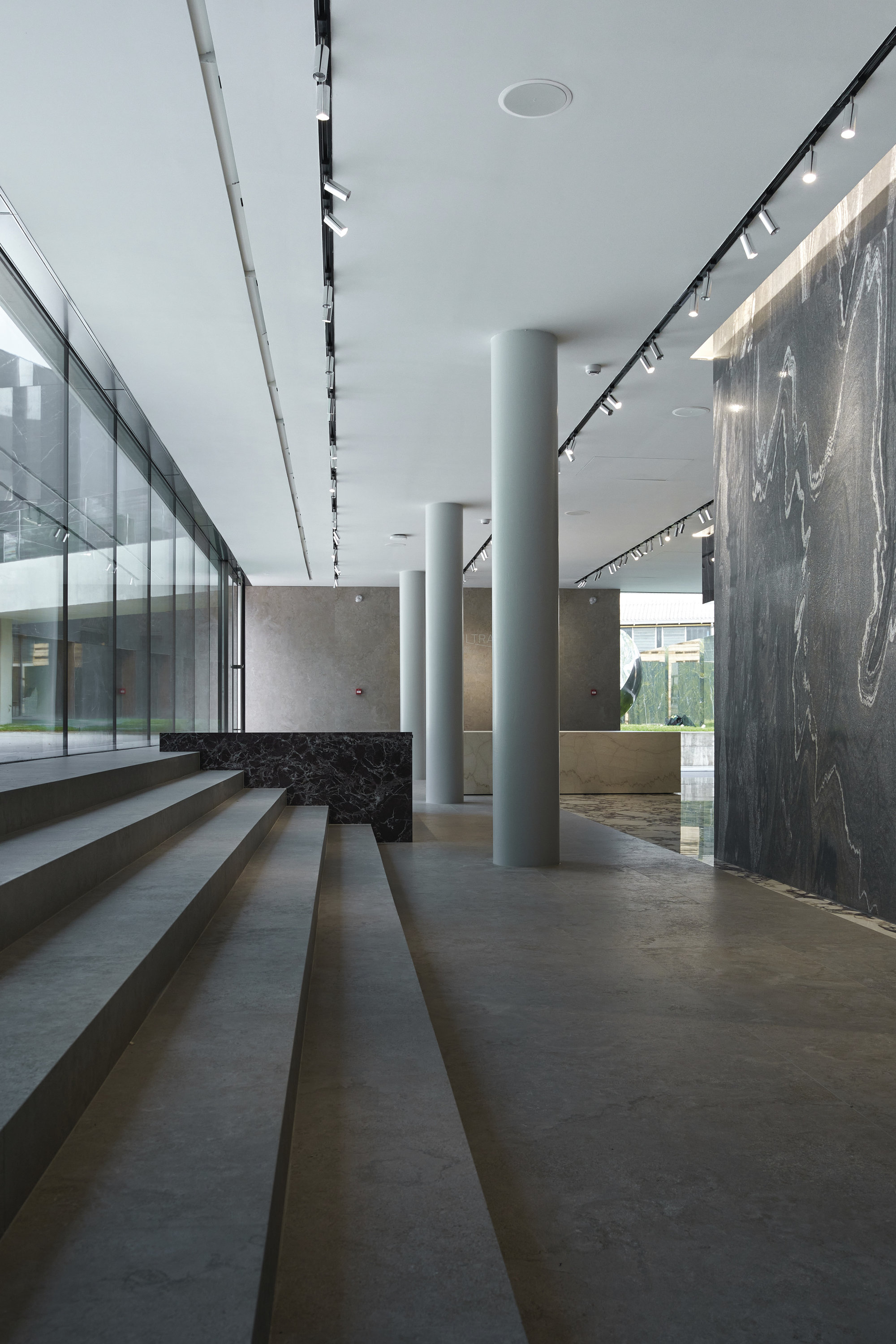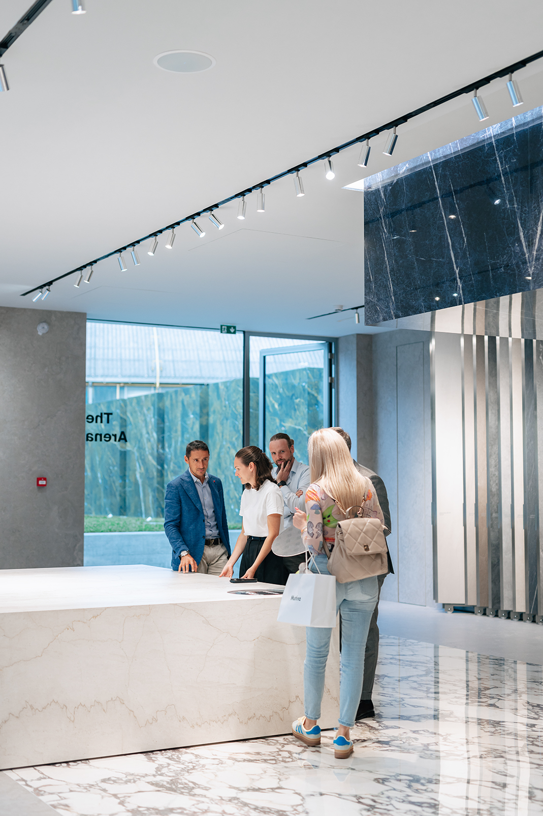 Questa “arena” scavata nel travertino diviene la culla dei valori del brand e di Iris Ceramica Group, palesando le nuove tecnologie e innovazioni. La realtà aumentata, video installazioni e interazioni fisiche offrono un’esperienza immersiva, valorizzando le tecnologie Active, Hypertouch e Attract.